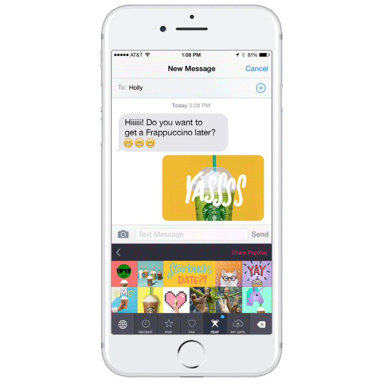 We created a series packs and platforms to give people the tools to better talk about their favorite coffee/sugary drink brand. These included a Starbucks Emoji Keyboard with 30+ custom emojis, the first branded Popkey keyboard in the market, and a branded sticker pack for Facebook Messenger.